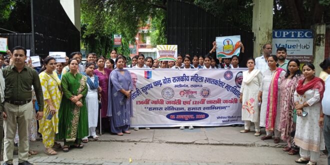 लखनऊ (टेलीस्कोप टुडे संवाददाता)। नेताजी सुभाष चंद्र बोस राजकीय महिला स्नातकोत्तर महाविद्यालय अलीगंज में गांधी एवं शास्त्री जयंती भव्यता पूर्वक मनाई गई। प्रभारी प्राचार्य प्रोफेसर विनीता लाल एवं सभी शिक्षकों कर्मचारियों ने महात्मा गांधी, लाल बहादुर शास्त्री एवं बाबा साहब भीमराव आंबेडकर के चित्रों पर माल्यार्पण किया। छात्राओं द्वारा सर्वधर्म प्रार्थना के अंतर्गत गीता, कुरान, बाइबिल तथा गुरुग्रंथ साहब का पाठ किया गया। साथ ही गांधी जी के प्रिय भजन “रघुपति राघव राजा राम” तथा “वैष्णव जन ते तेने कहिये” का सस्वर वाचन किया गया।