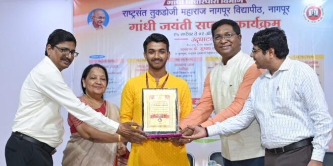वर्धा (टेलीस्कोप टुडे संवाददाता)। गांधी जयंती के अवसर पर महात्मा गांधी अंतरराष्ट्रीय हिंदी विश्वविद्यालय के इतिहास विभाग के छात्र मो. सोहैल अली को राष्ट्रसंत तुकडोजी महाराज नागपुर विश्वविद्यालय के पीजी डिपार्टमेंट ऑफ़ गांधीयन थॉट द्वारा आयोजित गांधी जयंती समारोह सप्ताह में सामान्य ज्ञान प्रतियोगिता में प्रथम स्थान के साथ स्वर्ण पदक और पुरस्कार प्राप्त हुआ।