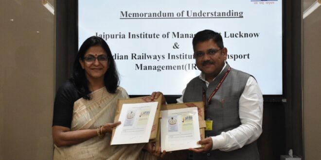 लखनऊ (टेलीस्कोप टुडे संवाददाता)। जयपुरिया इंस्टीट्यूट ऑफ मैनेजमेंट, लखनऊ ने आज इंडियन रेलवेज इंस्टीट्यूट ऑफ ट्रांसपोर्ट मैनेजमेंट (IRITM), रेल मंत्रालय, भारत सरकार के साथ एक महत्वपूर्ण समझौता ज्ञापन (MoU) पर हस्ताक्षर किए गए।