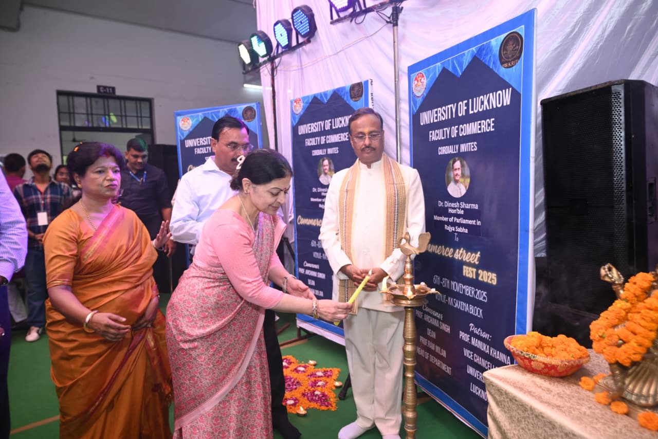 लखनऊ (टेलीस्कोप टुडे संवाददाता)। तीन दिवसीय कॉमर्स स्ट्रीट फेस्ट का शुभारम्भ कॉमर्स फैकल्टी, लखनऊ विश्वविद्यालय में हुआ। फेस्ट का शुभारंभ बतौर मुख्य अतिथि मौजूद राज्यसभा सांसद एवं पूर्व उप मुख्यमंत्री डा. दिनेश शर्मा एवं कुलपति प्रोफेसर मनुका खन्ना ने दीप प्रज्वलित कर किया। कार्यक्रम की संयोजक डीन फैकल्टी ऑफ कॉमर्स प्रोफेसर अर्चना सिंह ने पुष्प गुच्छ, शाल एवं स्मृति चित्र देकर अतिथियों का स्वागत किया।
