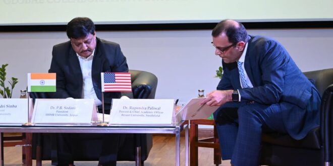 जयपुर (टेलीस्कोप टुडे संवाददाता)। आईआईएचएमआर यूनिवर्सिटी ने वैश्विक शिक्षा और रिसर्च के क्षेत्र में एक और मजबूत कदम बढ़ाते हुए अमेरिका की प्रतिष्ठित ब्रायंट यूनिवर्सिटी के साथ 3 सालो का एमओयू (MoU) किया गया है। इस एमओयू के साथ यूनिवर्सिटी के छात्रों और फैकल्टी के लिए अंतरराष्ट्रीय अवसरों के नए रास्ते खुलेंगे।