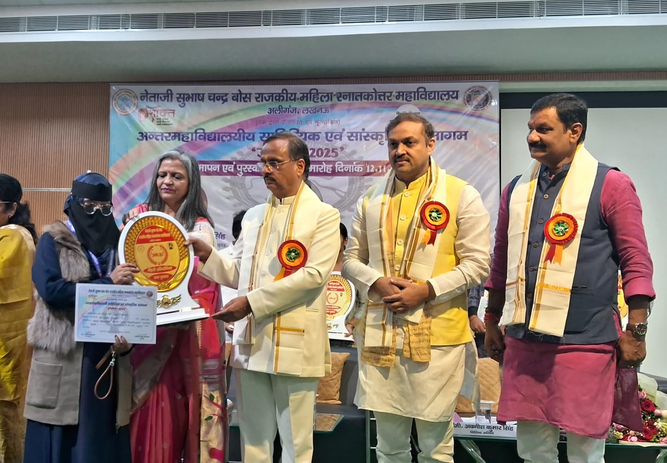 लखनऊ (टेलीस्कोप टुडे संवाददाता)। नेताजी सुभाष चंद्र बोस राजकीय महिला स्नातकोत्तर महाविद्यालय अलीगंज में चल रहे दो दिवसीय साहित्यिक सांस्कृतिक समागम उन्मेष 2025 का बुधवार को भव्य एवं रंगारंग कार्यक्रमों के साथ समापन हो गया। इस अवसर पर बतौर मुख्य अतिथि मौजूद राज्यसभा सांसद व पूर्व डिप्टी सीएम डा. दिनेश शर्मा ने विभिन्न प्रतियोगिताओं में स्थान प्राप्त करने वाले प्रतिभागियों को पुरस्कृत किया।