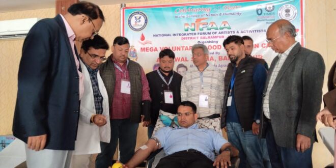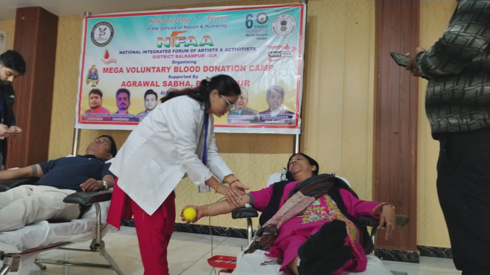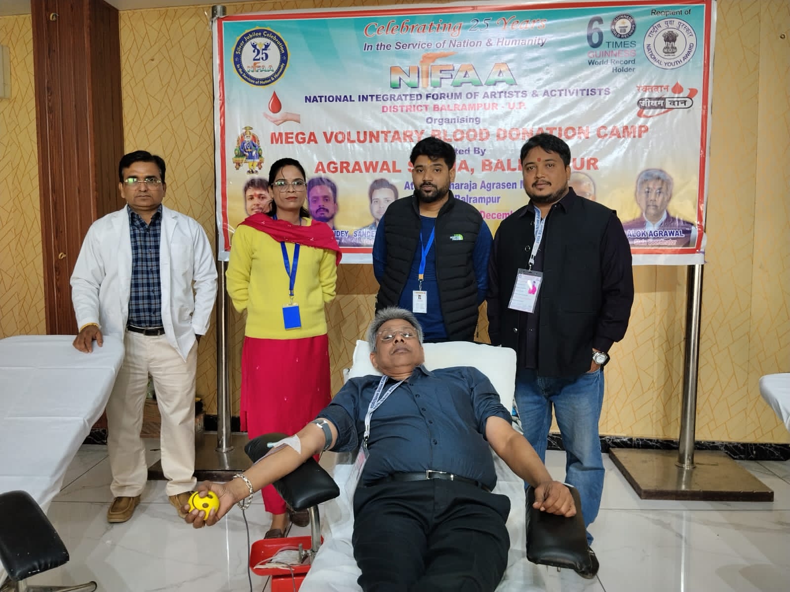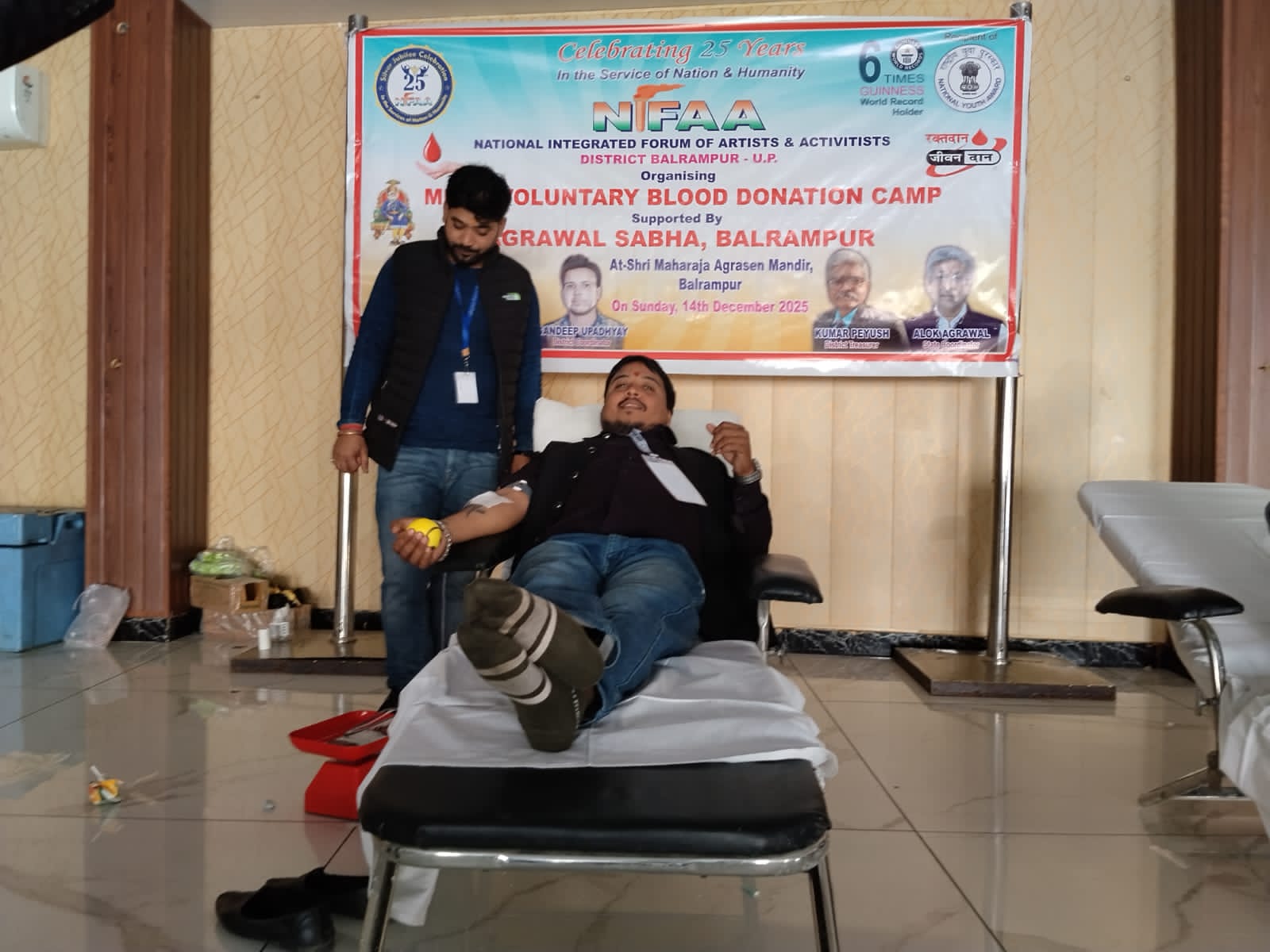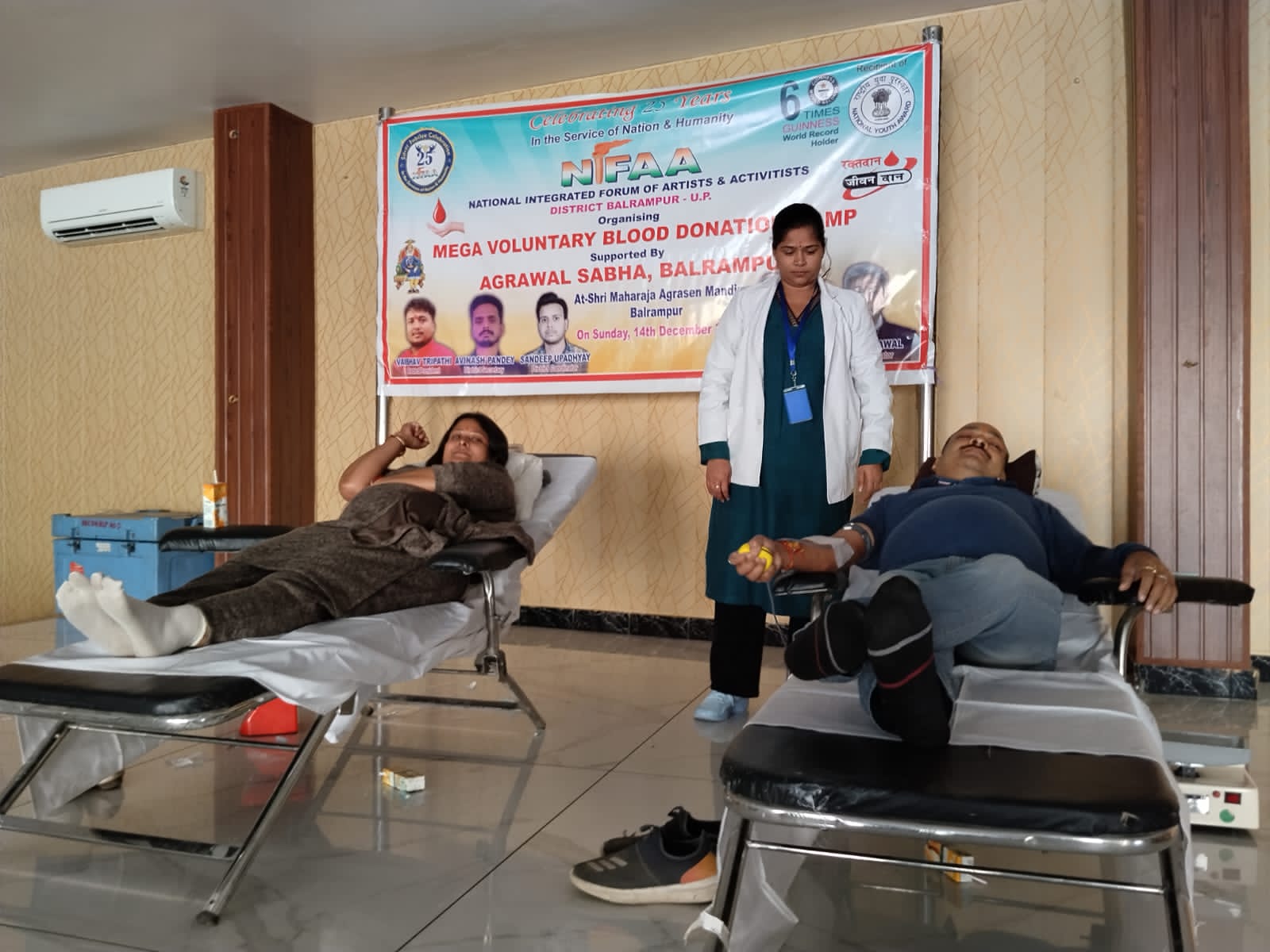 बलरामपुर (टेलीस्कोप टुडे संवाददाता)। 6 बार गिनीज़ बुक ऑफ़ वर्ड रिकॉर्ड प्राप्त कर चुकी सामाजिक संस्था नेशनल इंटीग्रेटेड फोरम ऑफ़ आर्टिस्ट्स एन्ड एक्टिविस्ट्स (निफा) एवं अग्रवाल सभा बलरामपुर के संयुक्त तत्वावधान में एक वृहद स्वैच्छिक रक्तदान शिविर का आयोजन किया गया। रविवार को लगे शिविर में रक्तदानियों ने बढ़ चढ़ कर प्रतिभाग किया।