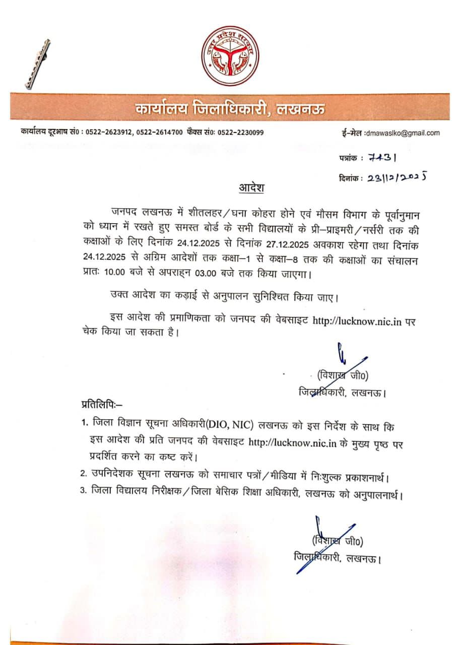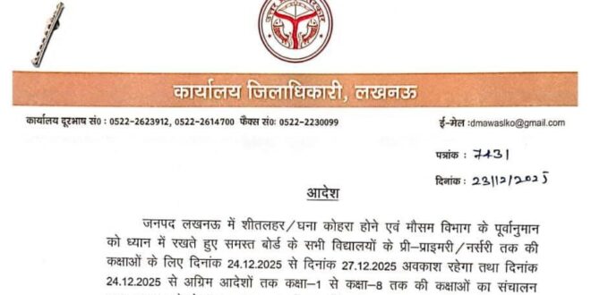 लखनऊ (टेलीस्कोप टुडे संवाददाता)। शीतलहर और कड़ाके की ठंड के साथ घने कोहरे की स्थिति को देखते हुए लखनऊ के जिलाधिकारी विशाखा जी ने विद्यालयों के संचालन को लेकर महत्वपूर्ण आदेश जारी किया है। मौसम विभाग के पूर्वानुमान को ध्यान में रखते हुए यह निर्णय छात्रों के स्वास्थ्य और सुरक्षा के हित में लिया गया है।