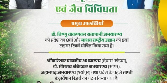 भोपाल : मध्य प्रदेश जिसे भारत का हृदय स्थल कहा जाता है, वह अपनी समृद्ध वन संपदा, जैव विविधता और वन्यजीव विरासत के लिए विश्व भर में अपनी विशिष्ट पहचान रखता है। वर्ष 2025 में इस पहचान को राज्य सरकार ने एक नई दिशा, नई गति और नई प्रतिबद्धता देने का काम किया है। यह वर्ष मध्य प्रदेश के लिए पर्यावरण संरक्षण, जैव विविधता संवर्धन और वन्यजीव सुरक्षा के क्षेत्र में नीतिगत, प्रशासनिक और वैचारिक स्तर पर एक निर्णायक मोड़ के रूप में उभरा।मुख्यमंत्री के नेतृत्व में सरकार ने 2025 को “संरक्षण आधारित विकास” का वर्ष बनाने का संकल्प लिया। मुख्यमंत्री डॉ. मोहन यादव ने कहा भी कि ‘हमारी वन संपदा भविष्य की पीढ़ियों के लिए धरोहर है और उनकी रक्षा राज्य की सर्वोच्च प्राथमिकताओं में शामिल है।’वर्ष 2025 में मध्य प्रदेश सरकार ने जो सबसे महत्वपूर्ण उपलब्धि हासिल की, वह रही नए वन्यजीव अभयारण्यों की स्थापना और घोषणा। राज्य मंत्री दिलीप अहिरवार के अनुसार 2025 में लिए गए निर्णयों का मूल उद्देश्य यह था कि राज्य के हर प्रमुख पारिस्थितिक क्षेत्र को संरक्षण के दायरे में लाया जाए और वन्यजीवों को सुरक्षित, निरंतर और वैज्ञानिक रूप से प्रबंधित आवास उपलब्ध कराया जाए।डॉ. भीमराव आंबेडकर वन्यजीव अभयारण्य2025 की शुरुआत में सागर जिले में डॉ. भीमराव आंबेडकर वन्यजीव अभयारण्य की स्थापना ने पूरे राज्य में एक मजबूत संदेश दिया। यह राज्य का 25वाँ वन्यजीव अभयारण्य बना और इसका नामकरण अपने आप में ऐतिहासिक था। यह अभयारण्य सागर जिले के बांदा और शाहगढ़ क्षेत्र में लगभग 258 वर्ग किलोमीटर में फैला है। यहाँ की पारिस्थितिकी शुष्क पर्णपाती वन, घासभूमि और झाड़ीदार वनस्पति का अद्वितीय मिश्रण है। इस क्षेत्र को संरक्षित दर्जा मिलने से चिंकारा, नीलगाय, सियार, लकड़बग्घा, विभिन्न पक्षी प्रजातियों और सरीसृपों को सुरक्षित आवास मिला। यह अभयारण्य स्थानीय समुदायों के लिए ईको-टूरिज्म, रोजगार और पर्यावरणीय जागरूकता के नए अवसर लेकर आया, जिससे संरक्षण और आजीविका के बीच संतुलन स्थापित हुआ।नर्मदा घाटी का संरक्षण कवच ओंकारेश्वर वन्यजीव अभयारण्ययदि डॉ. भीमराव आंबेडकर वन्यजीव अभयारण्य 2025 की आधारशिला था, तो ओंकारेश्वर वन्यजीव अभयारण्य उसकी सबसे बड़ी उपलब्धि के रूप में सामने आया। देवास और खंडवा जिलों में विस्तृत लगभग 614 वर्ग किलोमीटर क्षेत्र में फैले इस अभयारण्य की घोषणा राज्य स्थापना दिवस के अवसर पर की गई, जो अपने आप में संरक्षण के प्रति राज्य की प्रतिबद्धता को दर्शाता है।उल्लेखनीय है, नर्मदा घाटी के इस क्षेत्र का महत्व वन्यजीवों के साथ धार्मिक, सांस्कृतिक और पारिस्थितिक दृष्टि से अत्यंत संवेदनशील है। वन मंत्री के अनुसार, ओंकारेश्वर अभयारण्य वर्तमान व