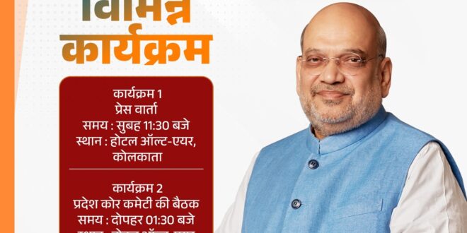 नई दिल्ली : भारतीय जनता पार्टी (भाजपा) के प्रमुख नेता और केंद्रीय गृह एवं सहकारितामंत्री अमित शाह आज पश्चिम बंगाल की राजधानी कोलकाता के प्रवास पर रहेंगे। राजधानी में उनके दो अहम कार्यक्रम हैं। यह जानकारी भाजपा ने अपने आधिकारिक एक्स हैंडल पर साझा की है।भाजपा एक हैंडल के अनुसार, केंद्रीयमंत्री शाह पूर्वाह्न साढ़े 11 बजे कोलकाता में संवाददाता सम्मेलन को संबोधित करेंगे। यह संवाददाता सम्मेलन राजधानी के होटल ऑल्ट-एयर में होगा। इसके लगभग दो घंटे बाद इसी होटल में भाजपा प्रदेश कोर कमेटी की बैठक आहूत की गई है। भाजपा नेता शाह इस बैठक में मौजूद रहेंगे।
