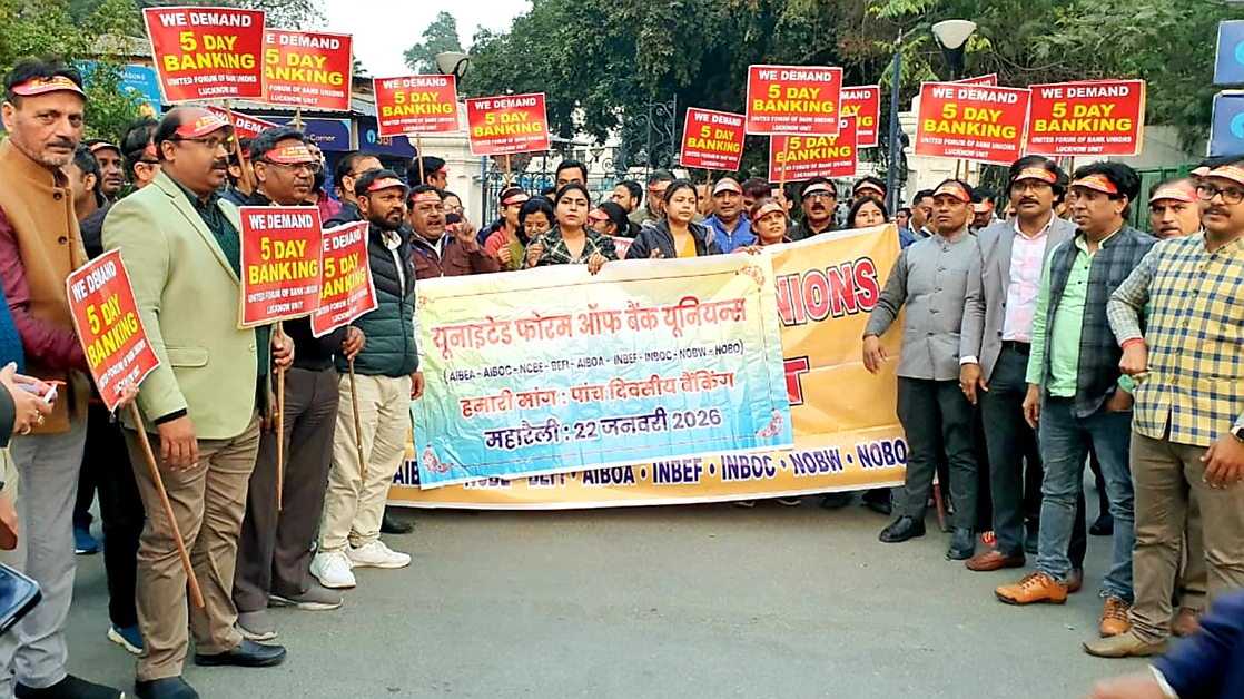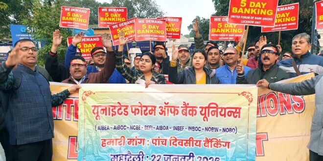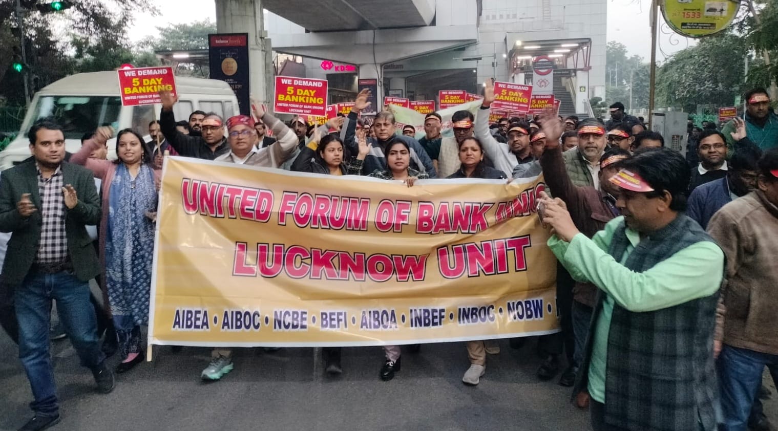 लखनऊ (टेलीस्कोप टुडे संवाददाता)। यूनाइटेड फोरम ऑफ बैंक यूनियंस के बैनर तले बैंककर्मियों ने केंद्र सरकार द्वारा 5 दिवसीय बैंकिंग लागू न करने के विरोध में स्टेट बैंक, मुख्य शाखा से विशाल रैली निकाल कर सभा की। फोरम के जिला संयोजक अनिल श्रीवास्तव ने बताया कि बैंककर्मियों ने इसके लिए कई प्रदर्शन व धरना किए तथा ट्विटर अभियान चलाया। लेकिन केंद्र सरकार हमारी इस एक मात्र मांग को भी मानने को तैयार नहीं है।