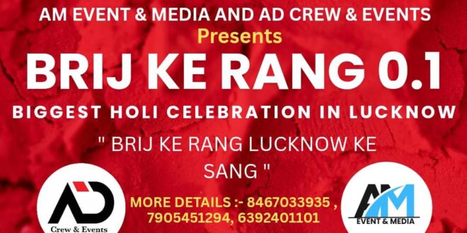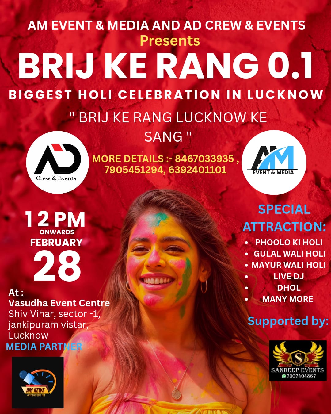 लखनऊ (टेलीस्कोप टुडे संवाददाता)। लखनऊ में इस बार होली का पर्व बेहद खास अंदाज़ में मनाया जाएगा। एम इवेंट एंड मीडिया और ए डी क्रू & इवेंट के संयुक्त तत्वाधान में भव्य होली सेलिब्रेशन इवेंट का आयोजन किया जा रहा है। यह रंगारंग कार्यक्रम 28 फरवरी को जानकीपुरम विस्तार, सेक्टर-1, शिव विहार स्थित वसुधा इवेंट सेंटर में आयोजित होगा।
