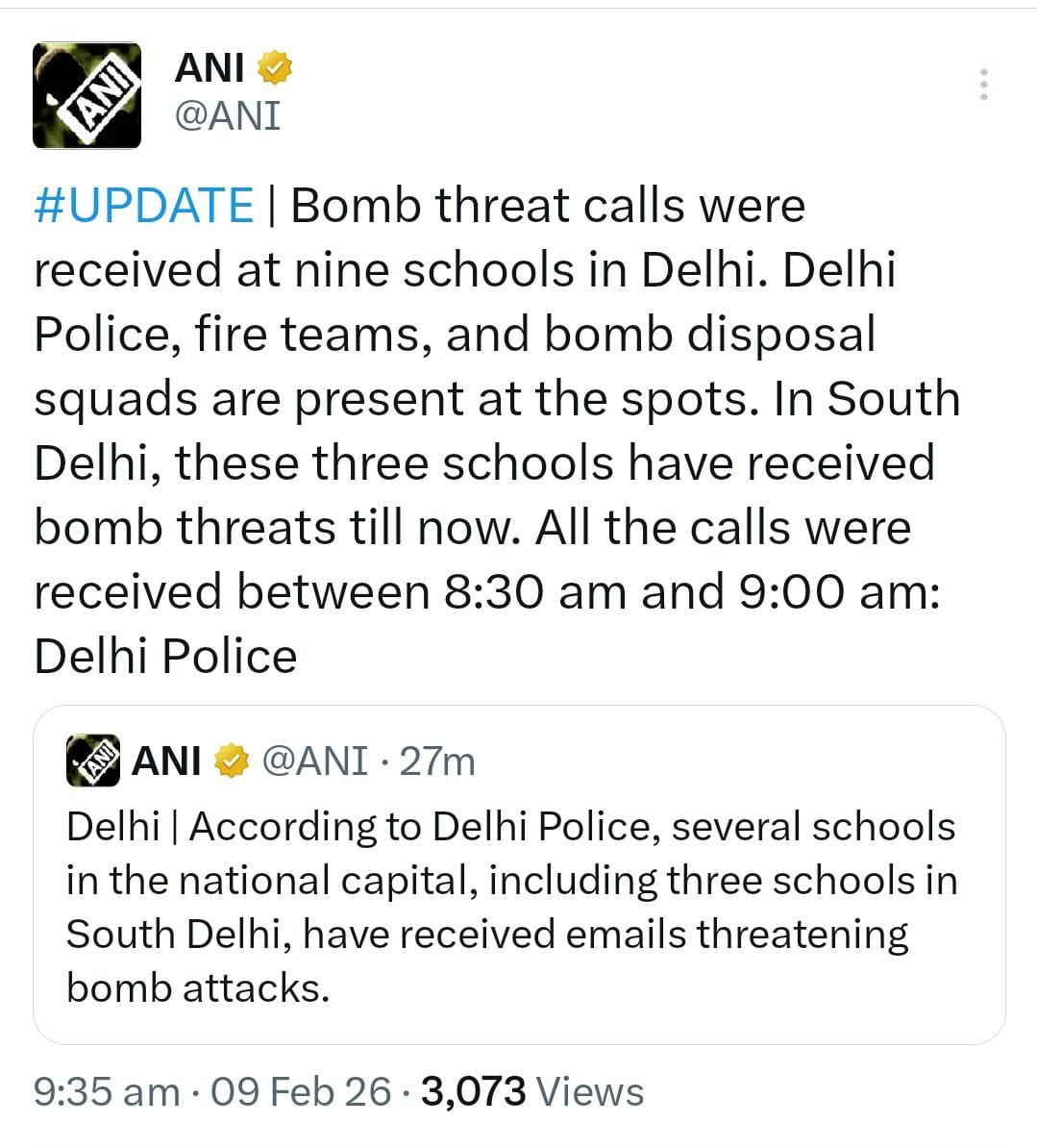 न्यूज एजेंसी ANI के मुताबिक पुलिस अधिकारियों ने बताया कि बम निरोधक दस्तों द्वारा स्कूल परिसरों की सघन जांच की जा रही है। अब तक किसी भी स्कूल से संदिग्ध वस्तु मिलने की पुष्टि नहीं हुई है। सुरक्षा के मद्देनज़र स्कूलों के आसपास अतिरिक्त पुलिस बल तैनात किया गया है।