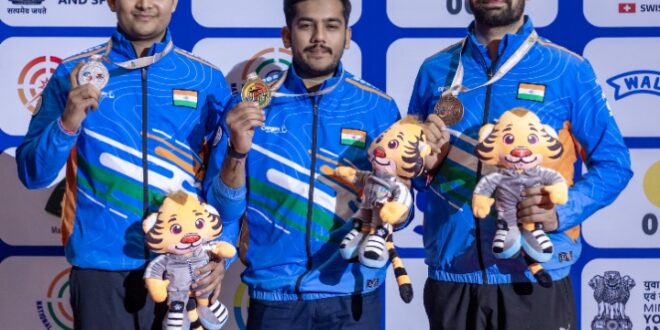 नई दिल्ली : नई दिल्ली के डॉ. कर्णी सिंह शूटिंग रेंज में एशियन राइफल-पिस्टल चैंपियनशिप 2026 के फाइनल में ऐश्वर्य प्रताप सिंह तोमर ने अपने अनुभव का शानदार प्रदर्शन करते हुए अंतिम शॉट में 10.7 का सटीक निशाना लगाया और नीरज कुमार को पछाड़कर 50 मीटर राइफल थ्री पोजीशंस स्पर्धा का स्वर्ण पदक अपने नाम किया। भारत ने इस स्पर्धा में क्लीन स्वीप किया, जिसमें अखिल श्योराण ने कांस्य पदक जीता।नीरज कुमार के लिए यह पहला व्यक्तिगत अंतरराष्ट्रीय पदक है। वह 35वें और अंतिम शॉट से पहले 0.2 अंकों की बढ़त पर थे। उन्होंने पहले निशाना साधते हुए 10.3 का स्कोर किया, जिससे ऐश्वर्य को स्वर्ण जीतने के लिए 10.6 की आवश्यकता थी। विश्व चैंपियनशिप रजत पदक विजेता ऐश्वर्य ने दबाव में बेहतरीन प्रदर्शन करते हुए 10.7 का शॉट लगाया और नीरज को पीछे छोड़ते हुए स्वर्ण पदक जीत लिया। ऐश्वर्य का कुल स्कोर 362.0 रहा, जबकि नीरज 361.8 अंकों के साथ रजत पदक पर रहे। अखिल श्योराण ने 343.5 के स्कोर के साथ कांस्य पदक हासिल किया।जूनियर पुरुष वर्ग के फाइनल में आद्रियान कर्माकर ने चैंपियनशिप का अपना दूसरा स्वर्ण पदक जीतते हुए 353.2 का स्कोर बनाया, जो कज़ाख़स्तान के रजत पदक विजेता दिमित्री किम से 4.7 अंक अधिक था। भारत के मनवेंद्र सिंह शेखावत ने 338.6 के स्कोर के साथ कांस्य पदक जीता।इससे पहले क्वालिफिकेशन में नीरज कुमार ने 593-34x के स्कोर के साथ शीर्ष स्थान हासिल कर फाइनल में प्रवेश किया। उनके बाद ऐश्वर्य (588-40x) और अखिल (588-32x) रहे। 10 मीटर एयर राइफल के स्वर्ण पदक विजेता रुद्रांक्श पाटिल ने 591-33x का स्कोर किया, जो क्वालिफिकेशन का दूसरा सर्वश्रेष्ठ स्कोर था, लेकिन वे केवल रैंकिंग पॉइंट्स के लिए प्रतिस्पर्धा कर रहे थे। निखिल तंवर ने भी रैंकिंग पॉइंट्स के लिए शूट करते हुए 587-29x का स्कोर किया। ऐश्वर्य, नीरज और अखिल की तिकड़ी ने टीम स्पर्धा में भी स्वर्ण पदक जीता, जबकि जापान और कज़ाख़स्तान ने क्रमशः रजत और कांस्य पदक हासिल किए।जूनियर फाइनल में आद्रियान ने आठ निशानेबाजों के फील्ड में शानदार प्रदर्शन किया। पहले पांच नीलिंग सीरीज़ के बाद वे केवल एक बार बढ़त में नहीं थे। छठे शॉट से बढ़त लेने के बाद उन्होंने पूरे मुकाबले में अपनी मजबूत पकड़ बनाए रखी और चैंपियनशिप का दूसरा स्वर्ण पदक जीता। मनवेंद्र सिंह शेखावत ने 338.6 के स्कोर के साथ कांस्य पदक हासिल किया। फाइनल में तीसरे भारतीय हेमंत बर्मन शूट-ऑफ में हारकर पांचवें स्थान पर रहे।एशियन शूटिंग चैंपियनशिप का समापन कल 50 मीटर राइफल प्रोन महिला और 25 मीटर सेंटर फायर पिस्टल पुरुष स्पर्धाओं के पदक मुकाबलों के साथ होगा।
