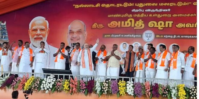 कारैक्कल : केंद्रीय गृह मंत्री अमित शाह ने शनिवार को पुडुचेरी के कारैक्कल में आयोजित भारतीय जनता पार्टी (भाजपा) की जनसभा को संबोधित करते हुए दावा किया कि आगामी 2026 विधानसभा चुनाव में राष्ट्रीय जनतांत्रिक गठबंधन (राजग) 60 प्रतिशत मत हासिल कर पुडुचेरी की सभी 24 सीटें जीतेगा। उन्होंने पुडुचेरी की जनता से राष्ट्रीय जनतांत्रिक गठबंधन (राजग) को निरंतर समर्थन देने की अपील की।जनसभा की शुरुआत करते हुए अमित शाह ने तिरुनल्लार के शनिश्वर भगवान और भद्रकाली अम्मन को नमन किया। उन्होंने कहा कि दुनिया की सबसे प्राचीन तमिल भाषा में भाषण न दे पाने के लिए वे क्षमा चाहते हैं। उन्होंने बताया कि उनके इस दौरे के दो प्रमुख उद्देश्य हैं। पहला, प्रधानमंत्री नरेन्द्र मोदी और पुडुचेरी के मुख्यमंत्री एन. रंगासामी के नेतृत्व वाली सरकार की उपलब्धियों को जनता के सामने रखना और दूसरा, पूर्ववर्ती शासकों की कार्यशैली को उजागर करना।उन्होंने कहा कि पिछले पांच वर्षों में पुडुचेरी में कानून-व्यवस्था में सुधार हुआ है और विकास की नई यात्रा शुरू की गई है। वर्ष 2021 के चुनाव में राजग को 44 प्रतिशत मत मिलने का उल्लेख करते हुए उन्होंने विश्वास जताया कि 2026 में यह आंकड़ा 60 प्रतिशत तक पहुंचेगा और गठबंधन सभी 24 सीटों पर विजय प्राप्त करेगा।कांग्रेस शासनकाल पर निशाना साधते हुए अमित शाह ने कहा कि केंद्र में कांग्रेस की सरकार के दौरान पाकिस्तान से आतंकवादी हमले होते रहे और इसे सामान्य घटना की तरह लिया गया। उन्होंने 2019 के पुलवामा हमले का जिक्र करते हुए शहीद 40 सीआरपीएफ जवानों को श्रद्धांजलि दी और कहा कि मोदी सरकार के कार्यकाल में पहली बार पाकिस्तान पर हवाई कार्रवाई की गई।पुडुचेरी के संदर्भ में उन्होंने कहा कि वर्तमान सरकार ने राजनीतिक स्थिरता स्थापित की है और भ्रष्टाचार पर अंकुश लगाया है। उन्होंने आरोप लगाया कि पूर्व मुख्यमंत्री वी. नारायणसामी के कार्यकाल में कोई नया उद्योग स्थापित नहीं हुआ, जबकि वर्तमान सरकार के प्रयासों से वस्त्र उद्योग को पुनर्जीवित किया जा रहा है।जनसभा के अंत में एक बार फिर से अमित शाह ने पुडुचेरी की जनता से अपील की कि वे राष्ट्रीय जनतांत्रिक गठबंधन को लगातार समर्थन दें और विकास की इस यात्रा को आगे बढ़ाएं।—————–