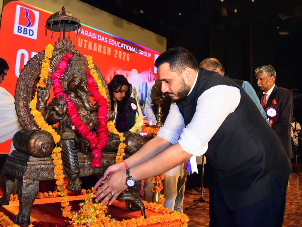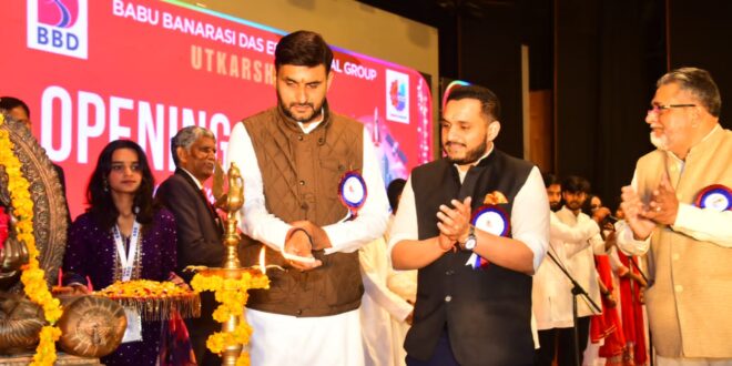 लखनऊ (टेलीस्कोप टुडे संवाददाता)। बाबू बनारसी दास एजूकेशनल ग्रुप के तत्वाधान में 26 से 28 फरवरी तक आयोजित तीन दिवसीय वार्षिकोत्सव उत्कर्ष-2026 का शानदार आगाज लखनऊ कैम्पस में हुआ। उत्कर्ष-2026 की थीम विरासत से विकास तक है। उद्घाटन समारोह के मुख्य अतिथि नीरज सिंह (चेयरमैन, फिक्की-लीडर्स फोरम, यू0पी0 चैप्टर एवं चैयरमैन, यू0पी0 योगा एसोसिएशन) एवं बीबीडी ग्रुप के प्रेसीडेंट एवं प्रो चांसलर, बीबीडी यूनीवर्सिटी विराज सागर दास ने दीप प्रज्जवलन कर कार्यक्रम का शुभारंभ किया।