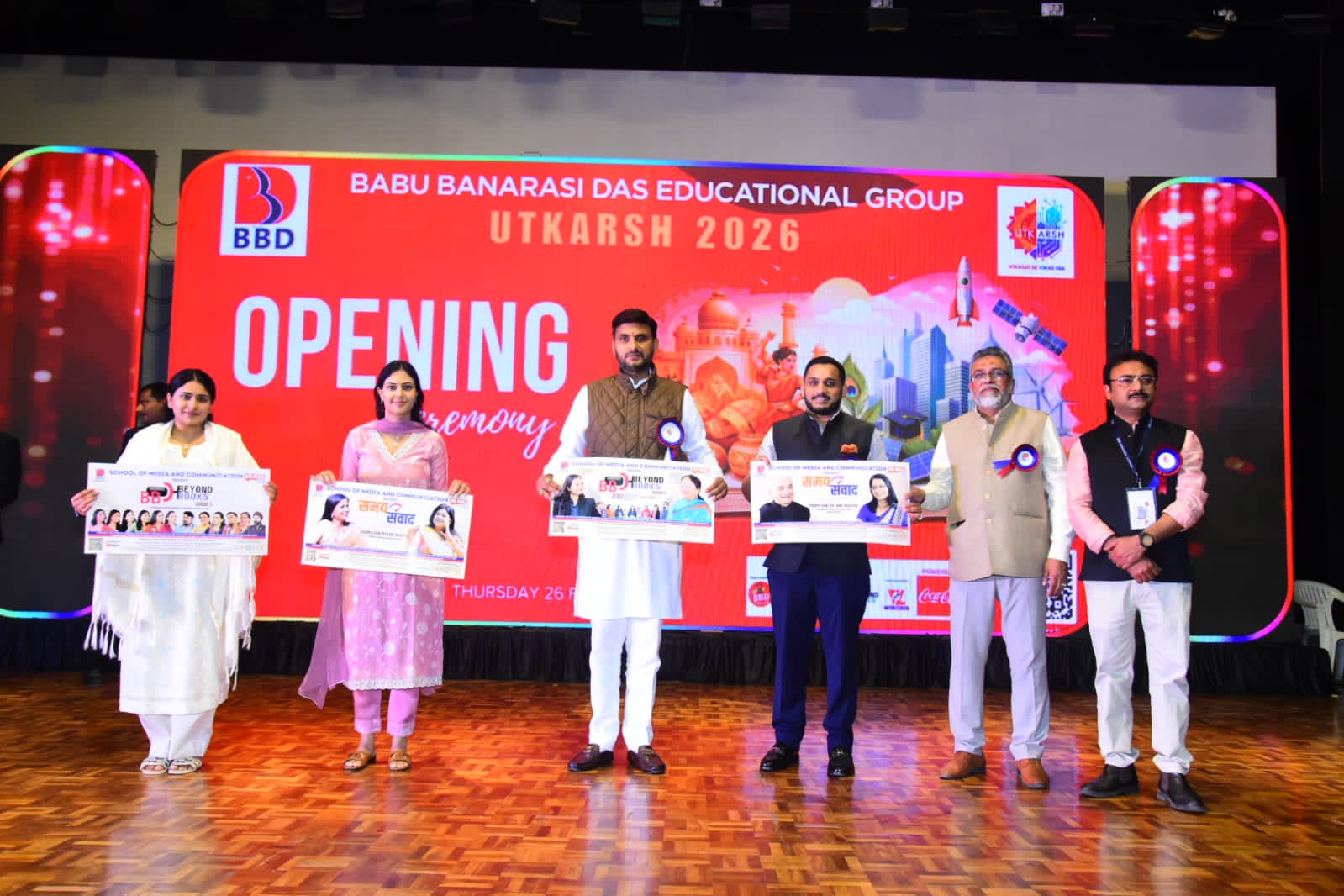 इस अवसर पर बीबीडी एजूकेशनल ग्रुप की वाइस प्रेसीडेंट सोनाक्षी दास एवं डायरेक्टर-अखिलेश दास गुप्ता स्कूल, देवाशी दास, आरके अग्रवाल, मुख्य अधिशाषी निदेशक, बीबीडी एजूकेशनल ग्रुप, प्रो0 एस0के0 श्रीवास्तव, वाइस चांसलर, डॉ एससी शर्मा, प्रो वाइस चांसलर, बीबीडी यूनीवर्सिटी, डॉ सुधर्मा सिंह, रजिस्ट्रार, बीबीडी यूनिवर्सिटी, डॉ0 एस0एम0के0 रिजवी, मुख्य संयोजक उत्कर्ष, सभी निदेशक, डीन, फैकल्टी, स्टाफ एवं छात्र-छात्राएं उपस्थित रहे। कार्यक्रम की शुरुआत गणेश वंदना के साथ छात्राओं द्वारा मनमोहक नृत्य प्रस्तुति द्वारा हुआ। तत्पश्चात् मुख्य अतिथि द्वारा उत्कर्ष-2026 के प्रारम्भ की घोषणा की।