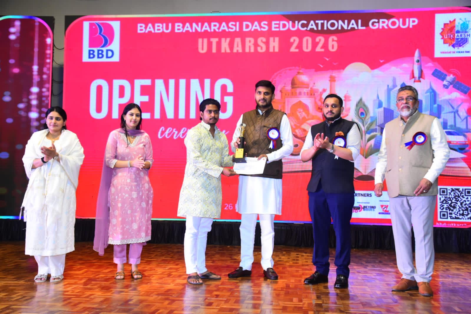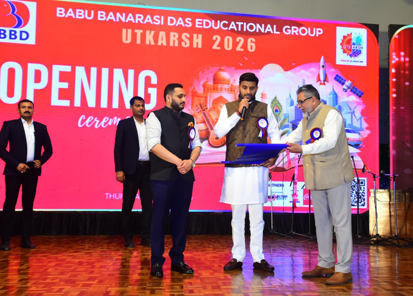 तत्पश्चात् प्रेसिडेंट विराज सागर दास ने उत्कर्ष 2026 के उद्घाटन समारोह में बीबीडी समूह की ओर से सभी अतिथियों, संकाय सदस्यों, विद्यार्थियों और मीडिया का स्वागत किया गया। उन्होंने बीबीडी यूनीवर्सिटी के वार्षिक सांस्कृतिक उत्सव को केवल प्रतिभा और सृजनात्मकता का मंच नहीं, बल्कि विरासत से विकास तक की प्रेरणादायी यात्रा का प्रतीक बताया गया।