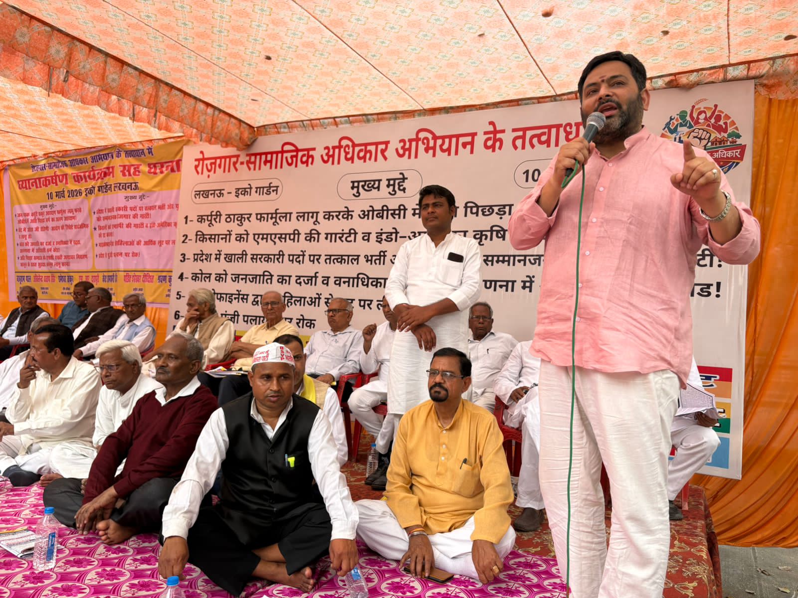 लखनऊ (टेलीस्कोप टुडे संवाददाता)। प्रदेश में किसानों को एमएसपी दिलाने और उनके हितों की रक्षा, युवाओं को रोजगार की गारंटी, अति पिछड़ा वर्ग को न्यायपूर्ण आरक्षण और आदिवासी समुदाय को वनाधिकार प्रदान करने के लिए रोजगार और सामाजिक अधिकार अभियान के तत्वाधान में ईको गार्डन में मंगलवार को ध्यानाकर्षण कार्यक्रम आयोजित किया गया।