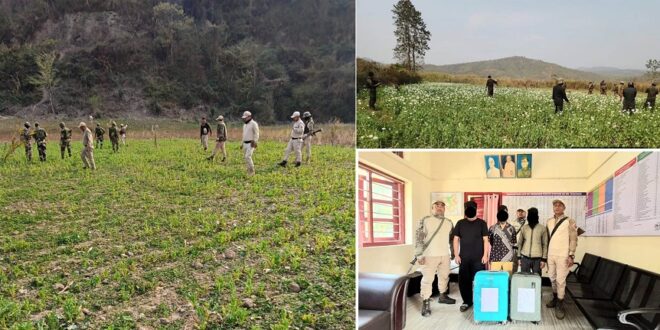 इंफाल : मणिपुर में मादक पदार्थ के विरूद्ध राज्य सरकार के निर्देश पर पुलिस प्रशासन पूरी तत्परता के साथ लगातार अभियान चलाते हुए जहां अफीम की खेती को नष्ट कर रही है, वहीं गांजा, हेरोइन समेत अन्य मादक पदार्थों को जब्त करने का कार्य भी जारी है। मणिपुर पुलिस मुख्यालय द्वारा आज तड़के दी गयी आधिकारिक जानकारी के अनुसार दो अलग अलग-अलग अभियानों में 35 एकड़ अफीम की खेती को नष्ट किया गया। साथ ही भारी मात्रा में गांजा के साथ तीन तस्करों को भी गिरफ्तार किया गया।मिली जानकारी के अनुसार मंगलवार को सुरक्षा बलों, एनसीबी और वन विभाग ने कांगपोकपी जिले के साइकुल थानांतर्गत टिंगपिबुंग गांव और लेपलेन गांव के बीच कई स्थानों पर लगभग 10 एकड़ में फैली अफीम की खेती को नष्ट कर दिया। हालांकि, इस मामले में किसी की भी गिरफ्तार नहीं हुई।वहीं एक अन्य अभियान में सुरक्षा बलों और वन विभाग ने उखरुल जिले के लिटान थानांतर्गत सिनाकेइथेई इलाके में लगभग 25 एकड़ में फैली अवैध अफीम की खेती को नष्ट किया गया।एक अन्य अभियान में मणिपुर पुलिस ने हिंगांग पुलिस थानांतर्गत मंत्रीपुखरी इलाके से प्रतिबंधित गांजा के साथ इंफाल पूर्वी जिले के तीन तस्करों को गिरफ्तार किया। आरोपितों की पहचान अरिबम मनीष (24),. शाजाबम असलम खान (32) और दिनेश चिंगाखाम (24) के रूप में की गयी है।तस्करों के पास एक चार-पहिया वाहन, लगभग 16.60 किलो गांजा बरामद किया गया। पुलिस एनडीपीएस एक्ट के तहत प्राथमिकी दर्ज कर आरोपितों से सघन पूछताछ कर रही है।——————–