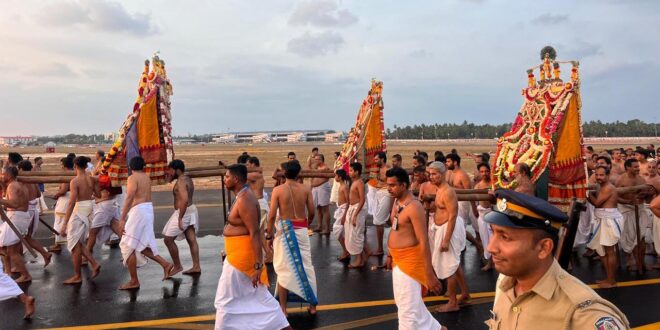 तिरुवनंतपुरम (टेलीस्कोप टुडे संवाददाता)। वैश्विक नागरिक उड्डयन में विरले ही देखने को मिलने वाले एक दृश्य के तहत, दक्षिण भारत के तिरुवनंतपुरम अंतरराष्ट्रीय हवाई अड्डे ने एक बार फिर अपने उच्च‑सुरक्षा रनवे को सदियों पुराने धार्मिक जुलूस के लिए औपचारिक मार्ग में परिवर्तित कर दिया। 2 अप्रैल को प्रसिद्ध श्री पद्मनाभस्वामी मंदिर के पैनकुनी आराट्टू जुलूस के आयोजन के लिए एयरपोर्ट पर लगभग चार घंटे के लिए उड़ान परिचालन अस्थायी रूप से रोक दिया गया। आधुनिक विमानन अवसंरचना द्वारा जीवंत विरासत को दिया गया यह सम्मान एक दुर्लभ और प्रेरक उदाहरण है।