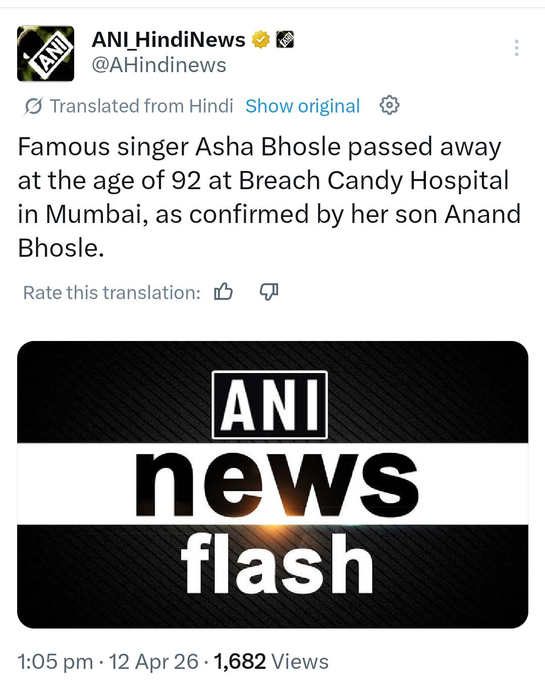 ANI के मुताबिक, ब्रीच कैंडी अस्पताल की डॉ. प्रतीत समदानी ने आशा भोसले के निधन की जानकारी देते हुए कहा, “आशा भोसले ने आज ब्रीच कैंडी अस्पताल में अंतिम सांस ली। मल्टी-ऑर्गन फेलियर के कारण उनका निधन हो गया।”