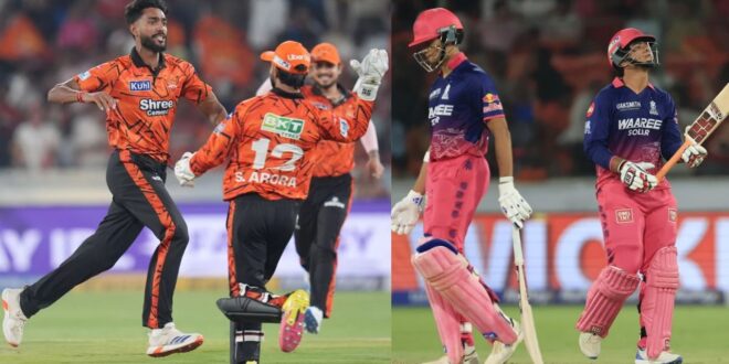 हैदराबाद : इंडियन प्रीमियर लीग 2026 में सनराइजर्स हैदराबाद (एसआरएच) ने शानदार प्रदर्शन करते हुए राजस्थान रॉयल्स (आरआर) को 57 रन से हराकर उनकी जीत की लय पर ब्रेक लगा दिया। इस मुकाबले के हीरो रहे डेब्यूटेंट गेंदबाज प्रफुल हिंगे और साकिब हुसैन, जिन्होंने मिलकर 8 विकेट झटके।राजीव गांधी इंटरनेशनल स्टेडियम में खेले गए इस मैच में पहले बल्लेबाजी करते हुए SRH ने 20 ओवर में 216/6 का मजबूत स्कोर खड़ा किया। ईशान किशन ने शानदार 91 रन की पारी खेली, जबकि हेनरिक क्लासेन ने 40 रन का योगदान दिया।लक्ष्य का पीछा करने उतरी राजस्थान की टीम की शुरुआत बेहद खराब रही। पारी के पहले ही ओवर में प्रफुल हिंगे ने तीन विकेट लेकर इतिहास रच दिया। उन्होंने वैभव सूर्यवंशी, ध्रुव जुरेल और ल्हुआन-ड्रे प्रिटोरियस को आउट कर राजस्थान रॉयल्स की कमर तोड़ दी।इसके बाद कप्तान रियान पराग भी हिंगे का शिकार बने। दूसरी ओर से साकिब हुसैन ने भी कमाल दिखाते हुए यशस्वी जायसवाल सहित कुल चार विकेट झटके।एक समय राजस्थान का स्कोर 9/5 हो गया था। हालांकि, डोनोवन फरेरा (69) और रवींद्र जडेजा (45) ने 118 रन की साझेदारी कर टीम को संभालने की कोशिश की, लेकिन यह प्रयास जीत के लिए नाकाफी साबित हुआ।अंत में राजस्थान की टीम 19 ओवर में 159 रन पर सिमट गई। एसआरएच के लिए हिंगे ने 4/34 और साकिब ने 4/24 के शानदार आंकड़े दर्ज किए।इस जीत के साथ एसआरएच ने पांच मैचों में दूसरी जीत हासिल कर अंक तालिका में चौथे स्थान पर छलांग लगाई, जबकि RR की लगातार जीत का सिलसिला टूट गया।