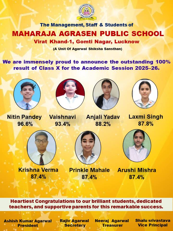 लखनऊ (टेलीस्कोप टुडे संवाददाता)। केंद्रीय माध्यमिक शिक्षा बोर्ड (CBSE) द्वारा बुधवार को घोषित 10वीं कक्षा के परीक्षा परिणाम में महाराजा अग्रसेन पब्लिक स्कूल गोमतीनगर के मेधावियों ने सफलता का परचम लहराया। विद्यालय का परिणाम शत प्रतिशत रहा और मेधावियों में खुशी की लहर दौड़ गई। हर वर्ष की तरह इस बार भी विद्यार्थियों ने उत्कृष्ट प्रदर्शन करते हुए स्कूल के साथ-साथ परिवार का नाम रोशन किया।
