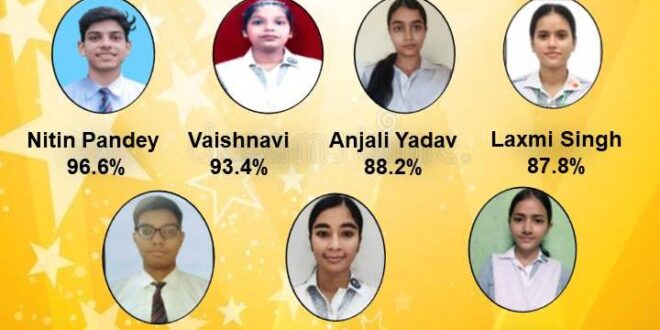 नितिन पाण्डेय ने 96.6 प्रतिशत अंकों के साथ विद्यालय में टॉप किया। वहीं वैष्णवी (93.4%) दूसरे, अंजली यादव (88.2%) तीसरे, लक्ष्मी सिंह (87.8%) चौथे पर रहीं। जबकि कृष्णा वर्मा, Prinkle Mahale व आरुषि मिश्रा ने 87.4% अंकों के साथ संयुक्त रूप से पांचवां स्थान हासिल किया। विद्यालय के अध्यक्ष आशीष कुमार अग्रवाल, सचिव राजीव अग्रवाल, कोषाध्यक्ष नीरज अग्रवाल, उप प्रधानाचार्य शालू श्रीवास्तव ने सभी मेधावियों को बधाई देते हुए उनके उज्जवल भविष्य की कामना की।